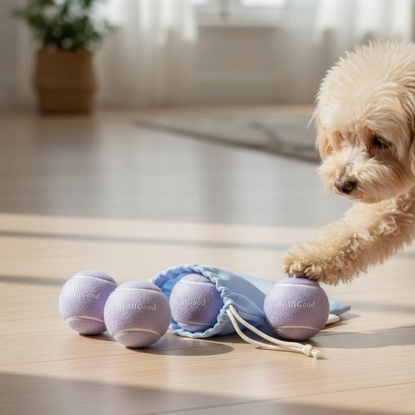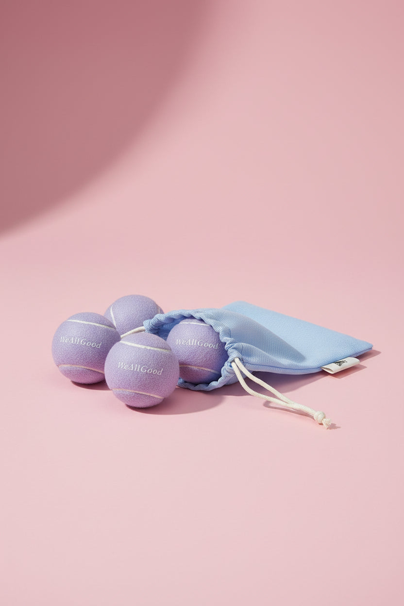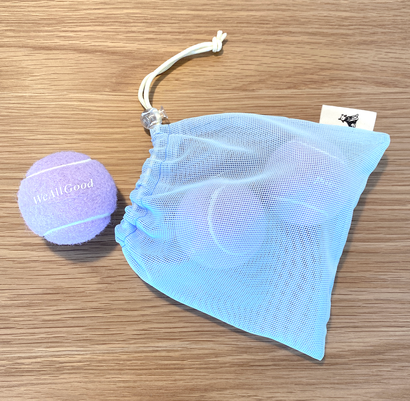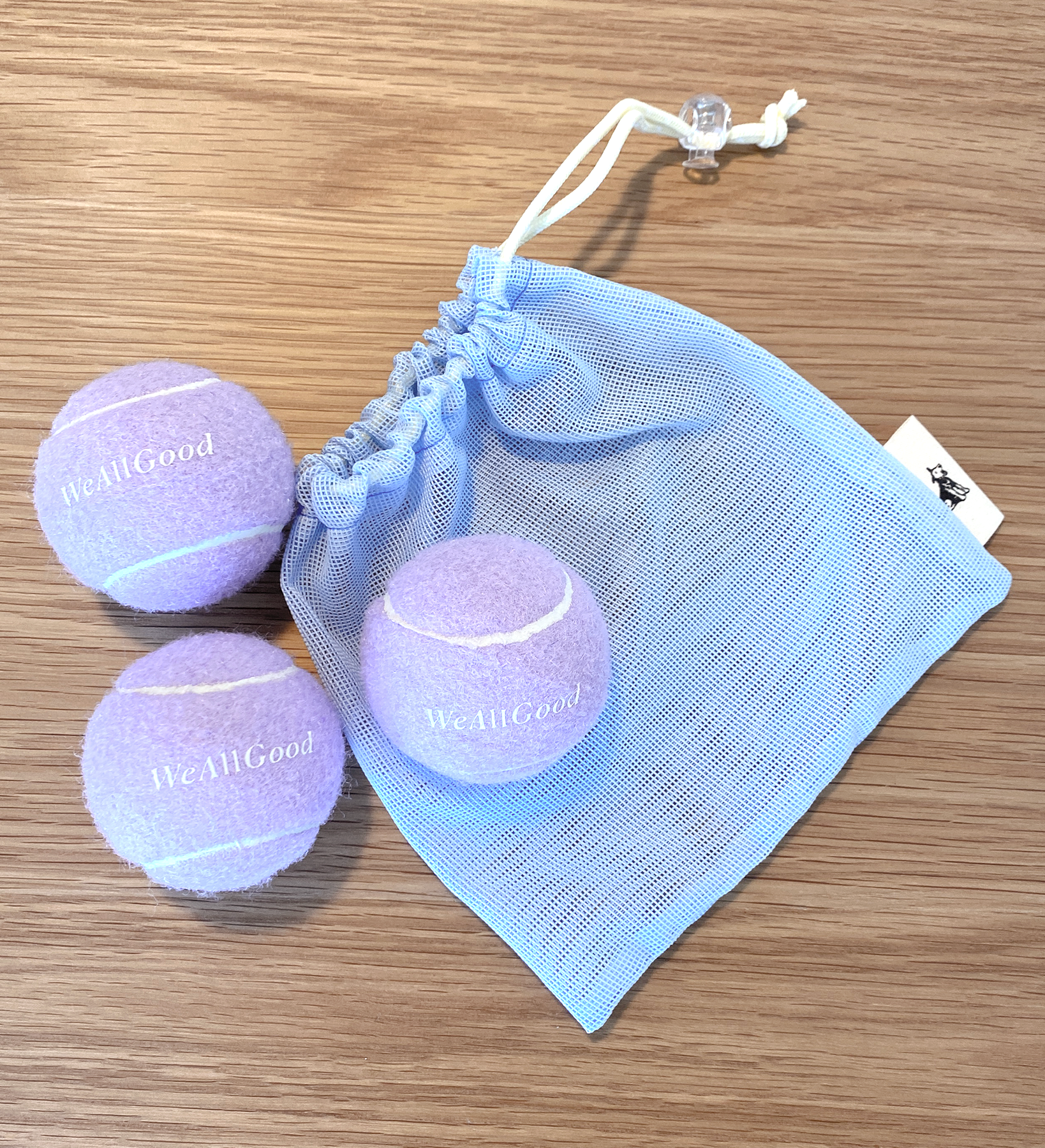 WeAllGoodのロゴ入りのパステルカラーボール3個と、持ち運びに便利なメッシュ巾着をセットにしました。