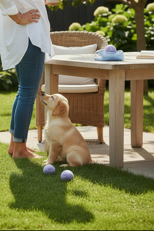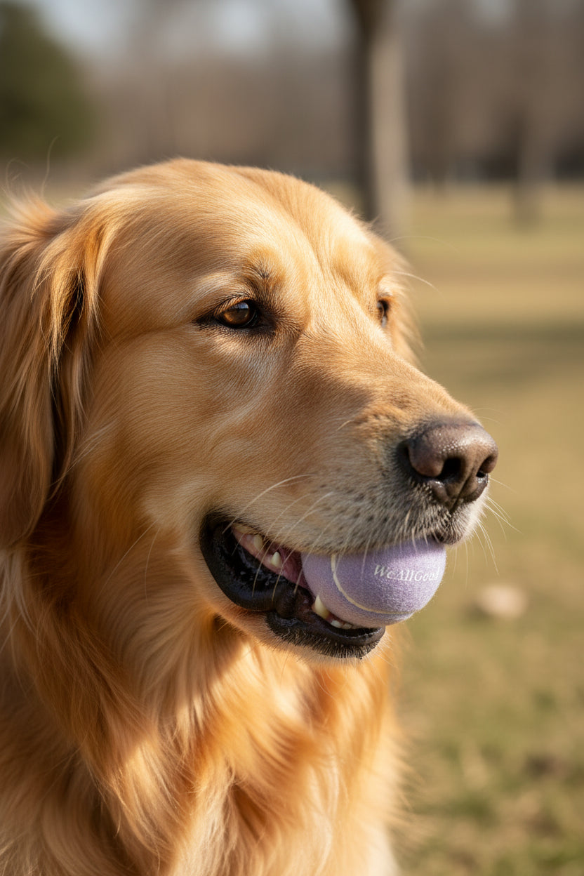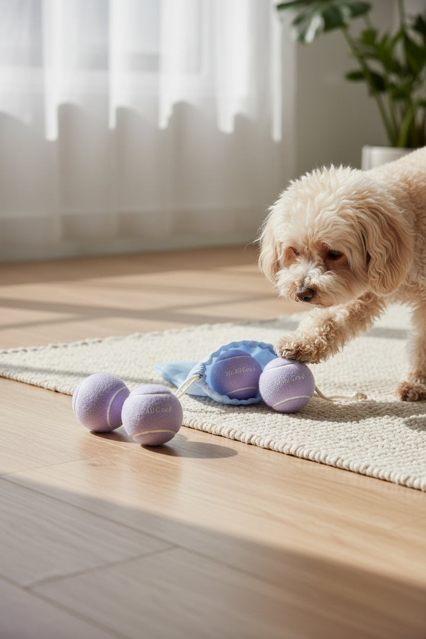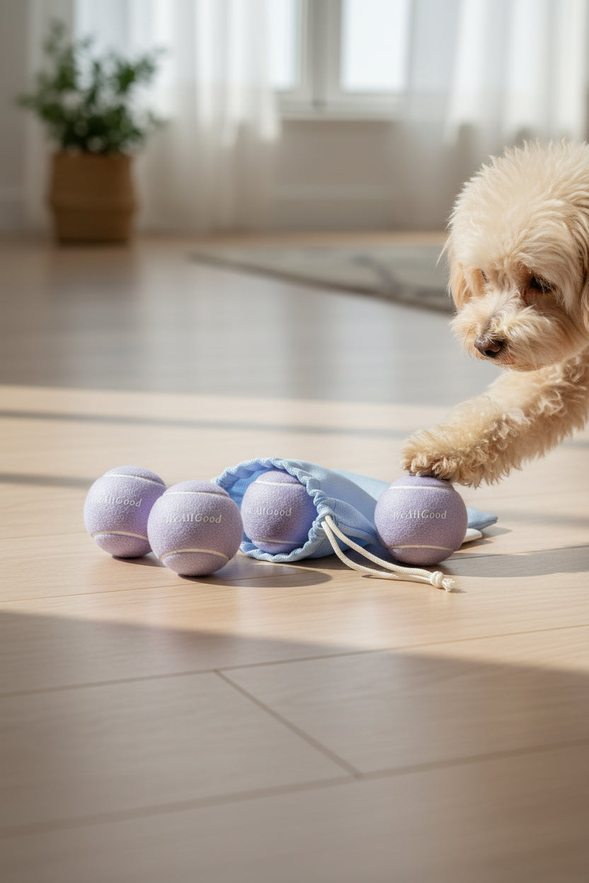 WeAllGoodのロゴ入りのパステルカラーボール3個と、持ち運びに便利なメッシュ巾着をセットにしました。