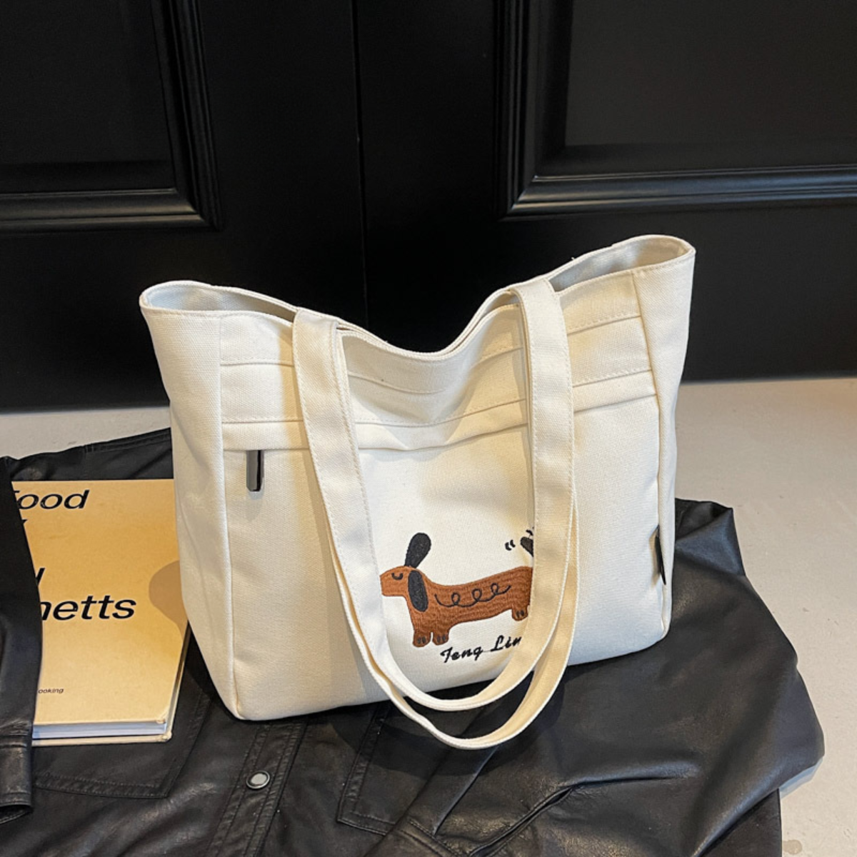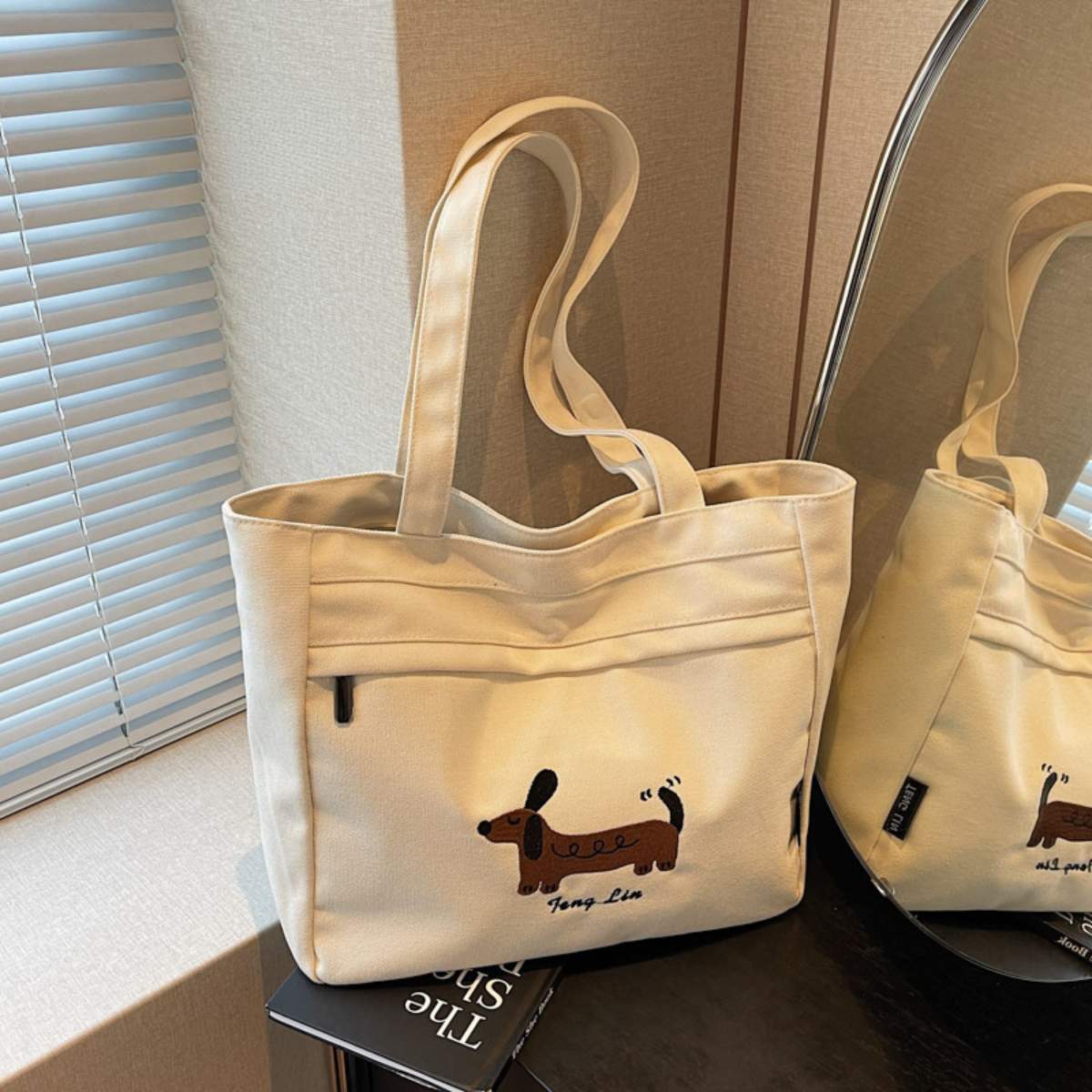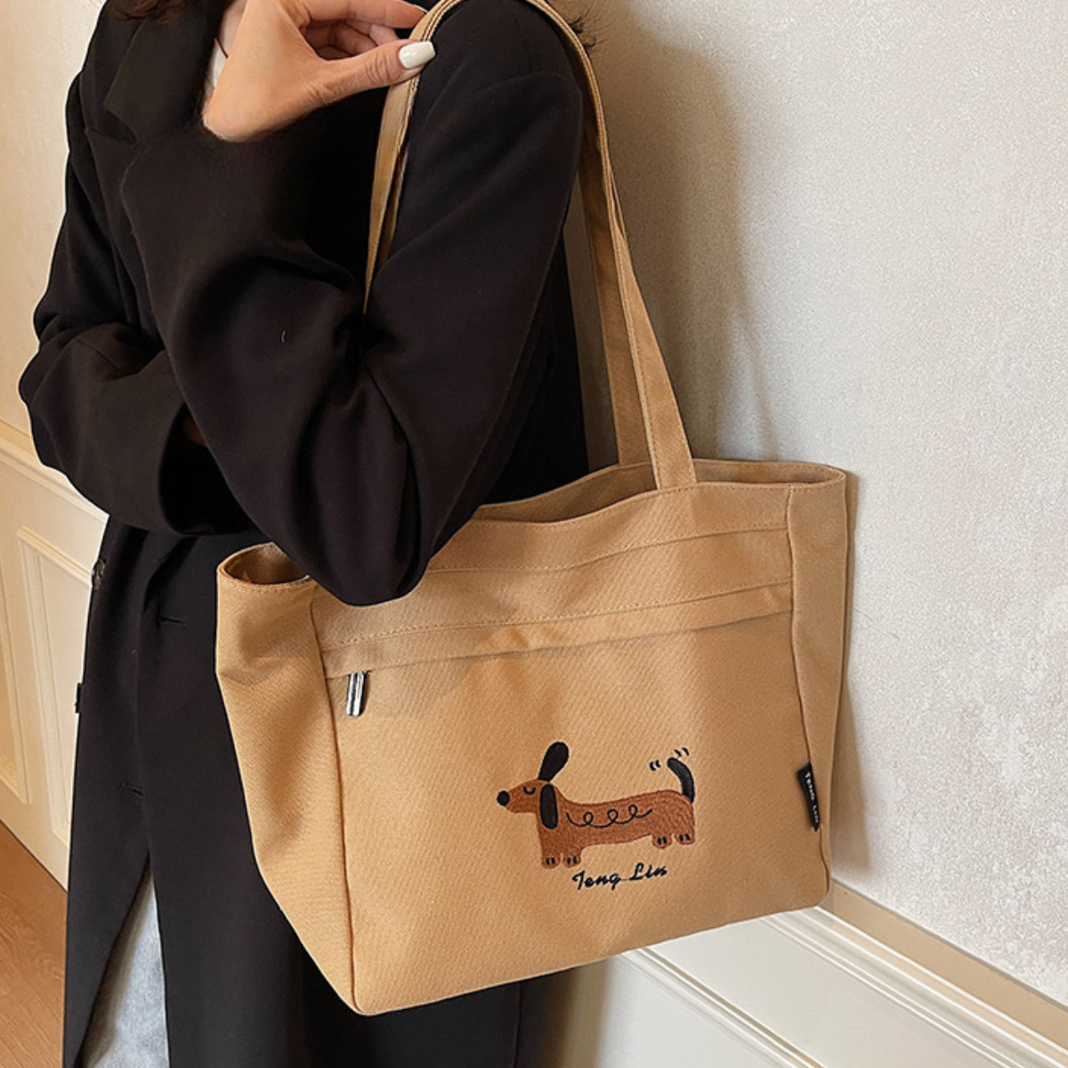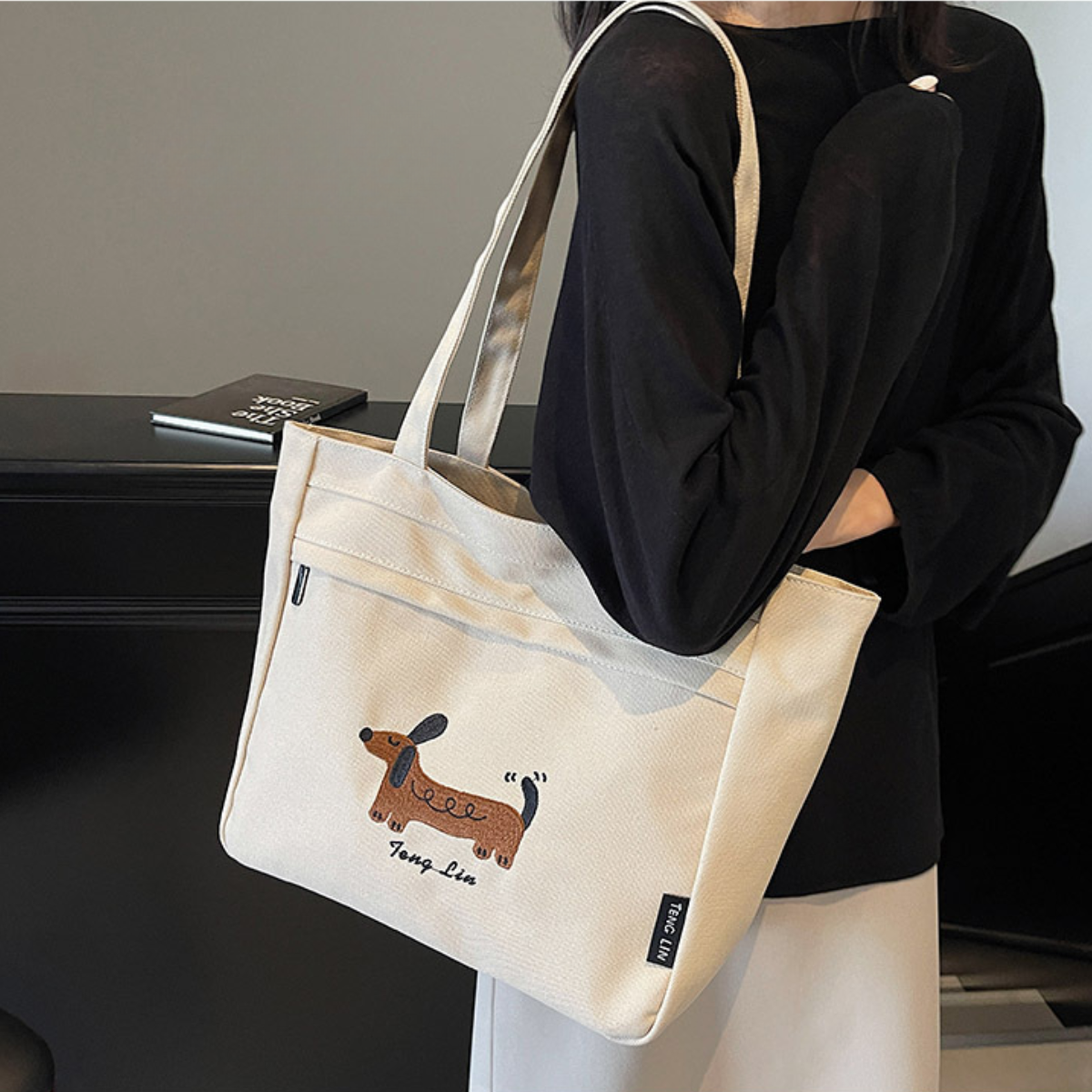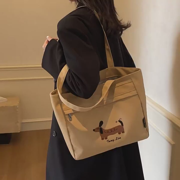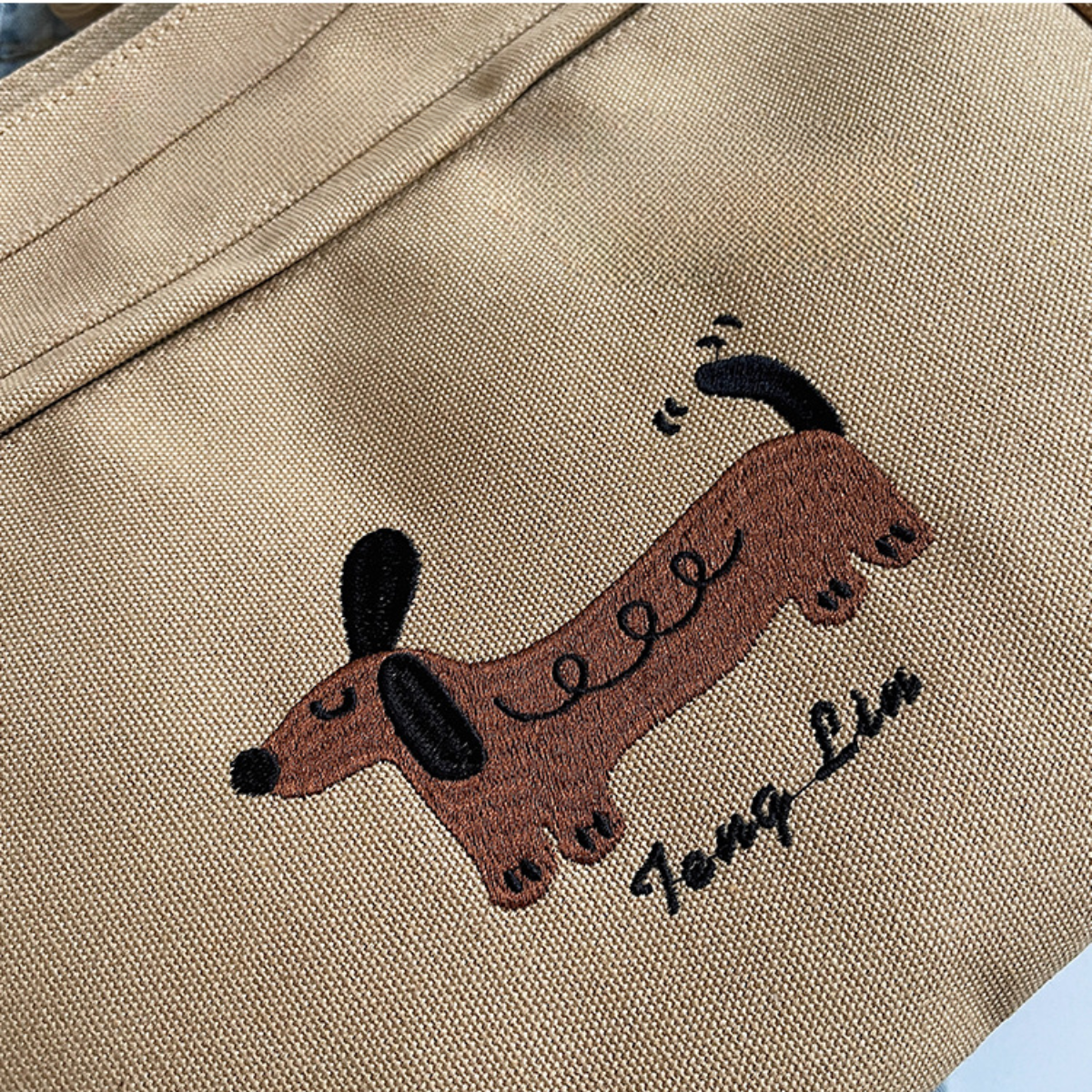愛らしいダックスフンドのステッチデザインが目を引く、シンプルで使いやすいトートバッグ。