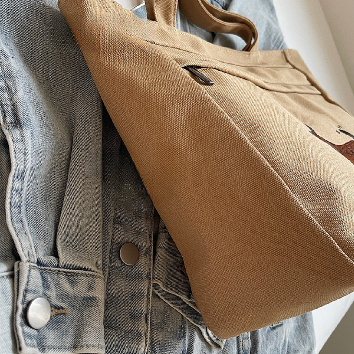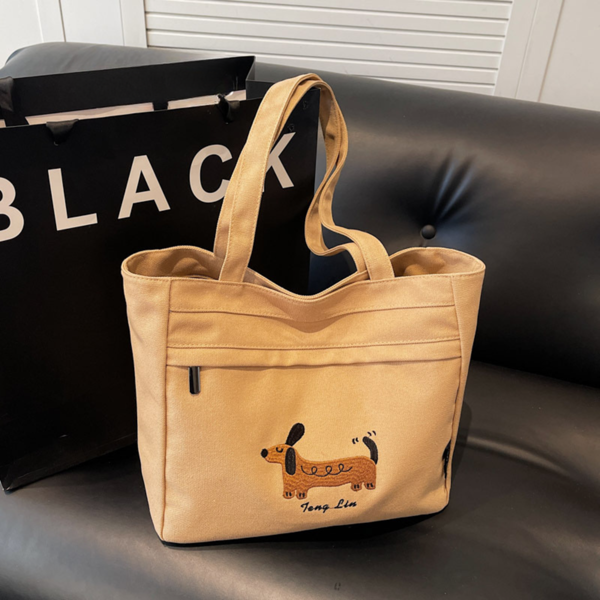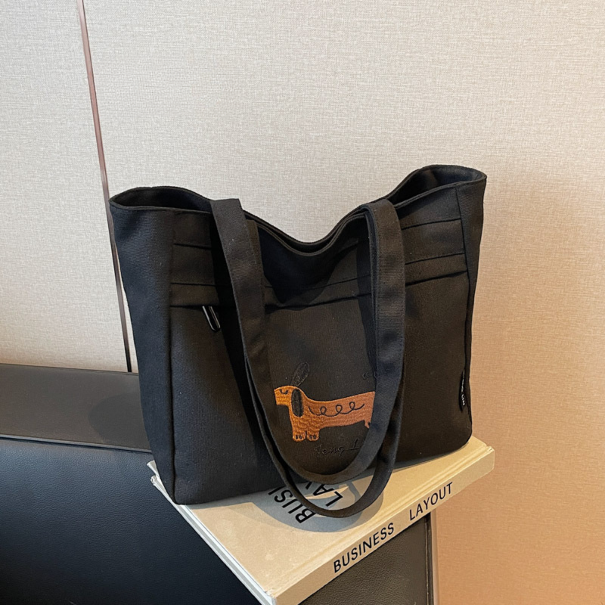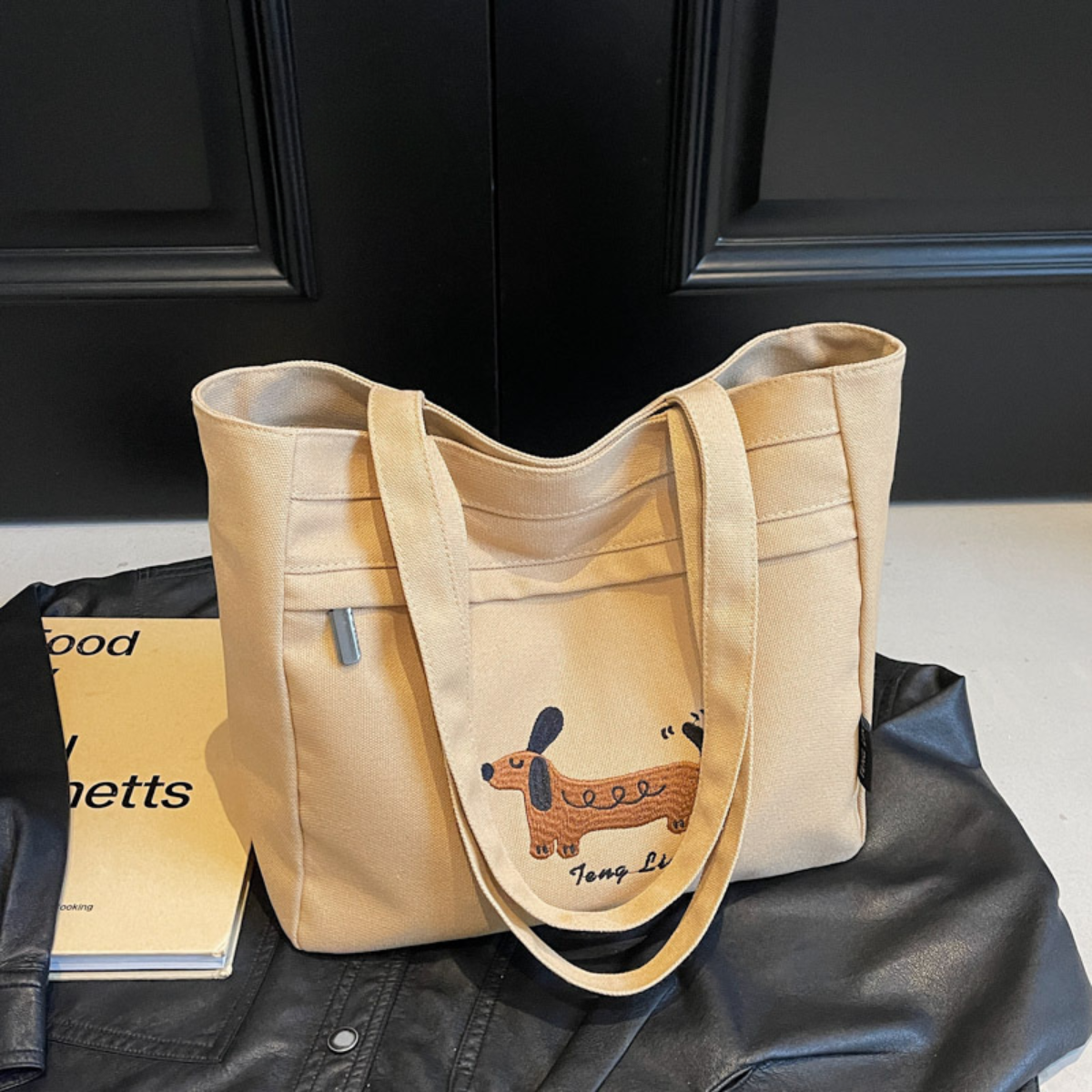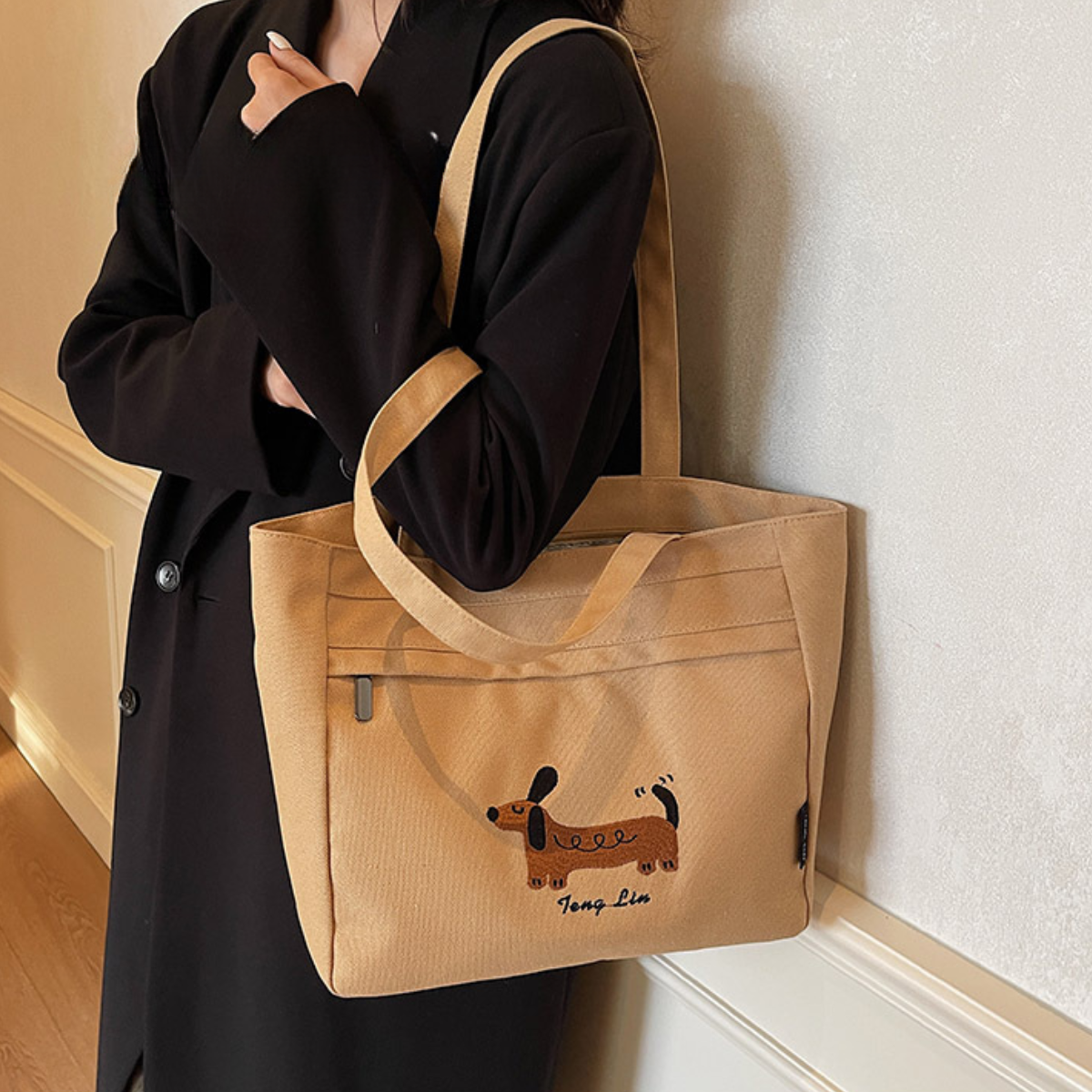 愛らしいダックスフンドのステッチデザインが目を引く、シンプルで使いやすいトートバッグ。